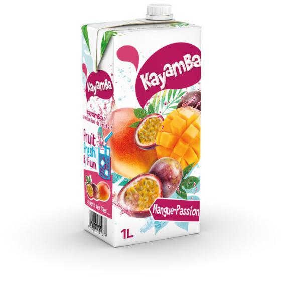 Eau, jus à base de concentrés : mangue (12%) - pomme (11%) - fruit de la passion (2%), sucre, fibres, acidifiant : acide citrique, arômes, antioxydant : acide ascorbique.