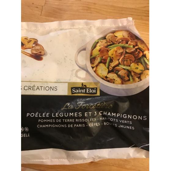 Pomme de terres rissolées 29,6% (pomme de terre, huile de tournesol), haricots verts 24,7%, champignons de paris 16,3%, cèpes 13,396 bolets jaunes 6,2%, beurre (dont lait), ail 2,1%, eau, persil 1,3%, fond brun (fècule de pomme de terre, sel, arômes naturels, oignons, sucre, graisse et extrait de boeuf, tomate, plante aromatique, épice), sel, poivre. INFORMATIONS : CONSERVATION : Compartiment à glace du réfrigérateur : 3 jours. Congélateur (-180C) : jusqu'à la date indiquée sur le côté du sachet.