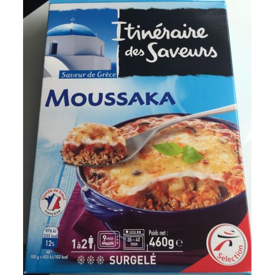 Eau, aubergines préfrites 24,6% (aubergines, huile de tournesol), viande bovine 16,3% (origine : France), oignons, double concentré de tomates 6,3%, purée de tomates 4,7%, farine de blé, tomates pelées concassées au jus 2,4% (tomates, jus de tomates), fromage (dont lait), huile de colza, poudre de lait, sel, chapelure 0,5% (farine de blé, levure, sel), amidon de maïs, origan, ail, fond de bœuf (extraits de végétaux et de plantes aromatiques, extrait de viande de bœuf, viande de bœuf, extraits d'épices et d'aromates), cumin, thym, poivre blanc, muscade. Pourcentages exprimés sur le poids net total.