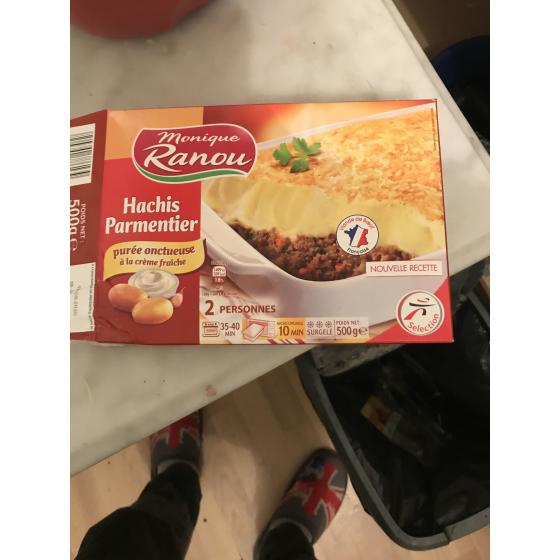 Purée de pommes de terre cuisinée 60,6% [eau, flocons de pommes de terre 8,6% (pommes de terre, curcuma en poudre), crème fraîche (dont lait) 8,2%, poudre de lait, sel, emmental (dont lait), poivre], viande de bœuf (origine : France) 20%, oignons, carottes, eau, chapelure (farine de blé,levure), flocons de pommes de terre (pommes de terre, curcuma en poudre), ail,persil, arômes naturels, extrait de malt (blé), sel, poivre. Pourcentages exprimés sur le poids net total.