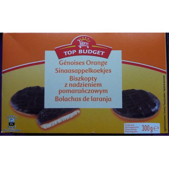 Fourrage 55% (sirop de glucose-fructose, sucre, jus d'orange à base de jus concentré 10,5% (correspondant à 5,8% dans produit fini), gélifiant : pectines, acidifiant : acide citrique, arôme), biscuit 30% (farine de blé 39%, sucre, œufs entier liquide, stabilisant : sirop de sorbitol, graisse végétale (palme), amidon de blé 3,5%, sirop de glucose-fructose, amidon de tapioca, poudres à lever : carbonates d'ammonium, carbonates de sodium, émulsifiant : mono - et diglycérides d'acides gras, correcteur d'acidité : citrates de sodium, sel), chocolat noir 15% (pâte de cacao, sucre, beurre de cacao, émuilsifiant : lécithines ( soja ), arôme).