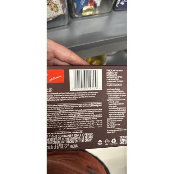 Farine de blé, sucre, pâte de cacao, huile de palme, beurre de cacao, sirop de glucose, produits à base de lactosérum (lait), beurre clarifié, poudres à lever : carbonates de sodium, diphosphates ; sel, émulsifiant : lécithines ; arômes, lait écrémé en poudre, amidon (blé), acidifiant : acide citrique. Peut contenir : œufs, noisettes