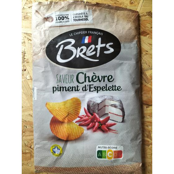 Ingrédients:Pommes de terre (France) (61,9%), huile de tournesol (31%), petit lait en poudre, arômes naturels (lait), sel, fromage de chèvre fondu en poudre (0,9%), piment d'Espelette AOP (0,72%), épices (curcuma, poivre).