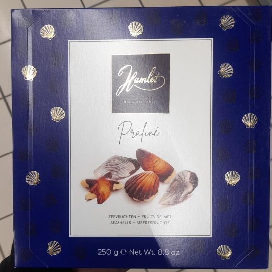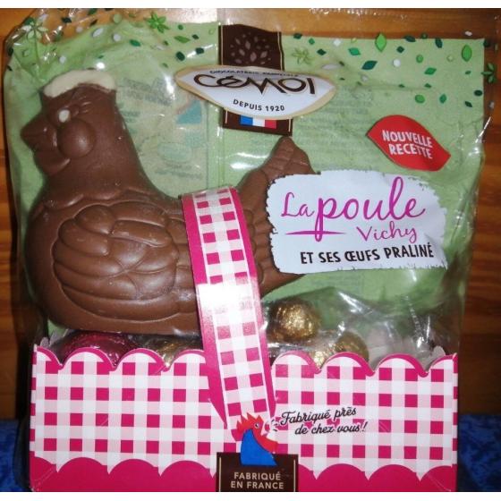 Ingrédients:Poule en chocolat au lait supérieur décoré : sucre, beurre de cacao, poudre de lait entier, pâte de cacao, lactose, poudre de lait écrémé, émulsifiant : lécithine de tournesol, arôme naturel de vanille, arome naturel. Bonbons de chocolat au lait fourrage au praliné : chocolat au lait (sucre, poudre de lait entier, beurre de cacao, pâte de cacao, émulsifiants : lécithine de tournesol - polyricinoléate de polyglycérol, arôme naturel de vanille), sucre, graisses végétales (palmiste, palme), praliné 9% (pâte de noisettes, sucre), lactose, lactosérum en poudre, poudre de lait entier, huile de tournesol, cacao maigre en poudre, émulsifiant : lécithine de tournesol, arômes.