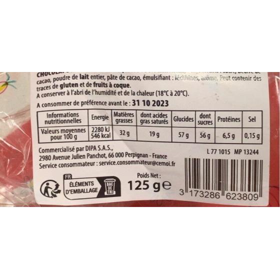 Ingrédients:Sucre, poudre de lait entier 26%, graisses végétales (palme, palmiste), beurre de cacao, pâte de cacao, huile de tournesol, poudre de lait écrémé, émulsifiant : lécithines de tournesol, arômes.