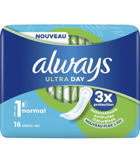 • SERVIETTE HYGIÉNIQUE ULTRA DAY SANS AILETTES ALWAYS X16